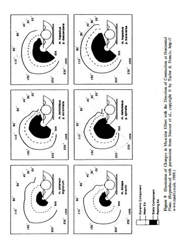 significantly higher than those of 20°, 30°, 40°, 60°, and 230°. With regard to the musculature of the shoulder region represented by two recordings of the trapezius (right part of Figure 9), an essentially lower dependence of the muscular strain on the direction of the repetitive horizontal arm movements was observed.